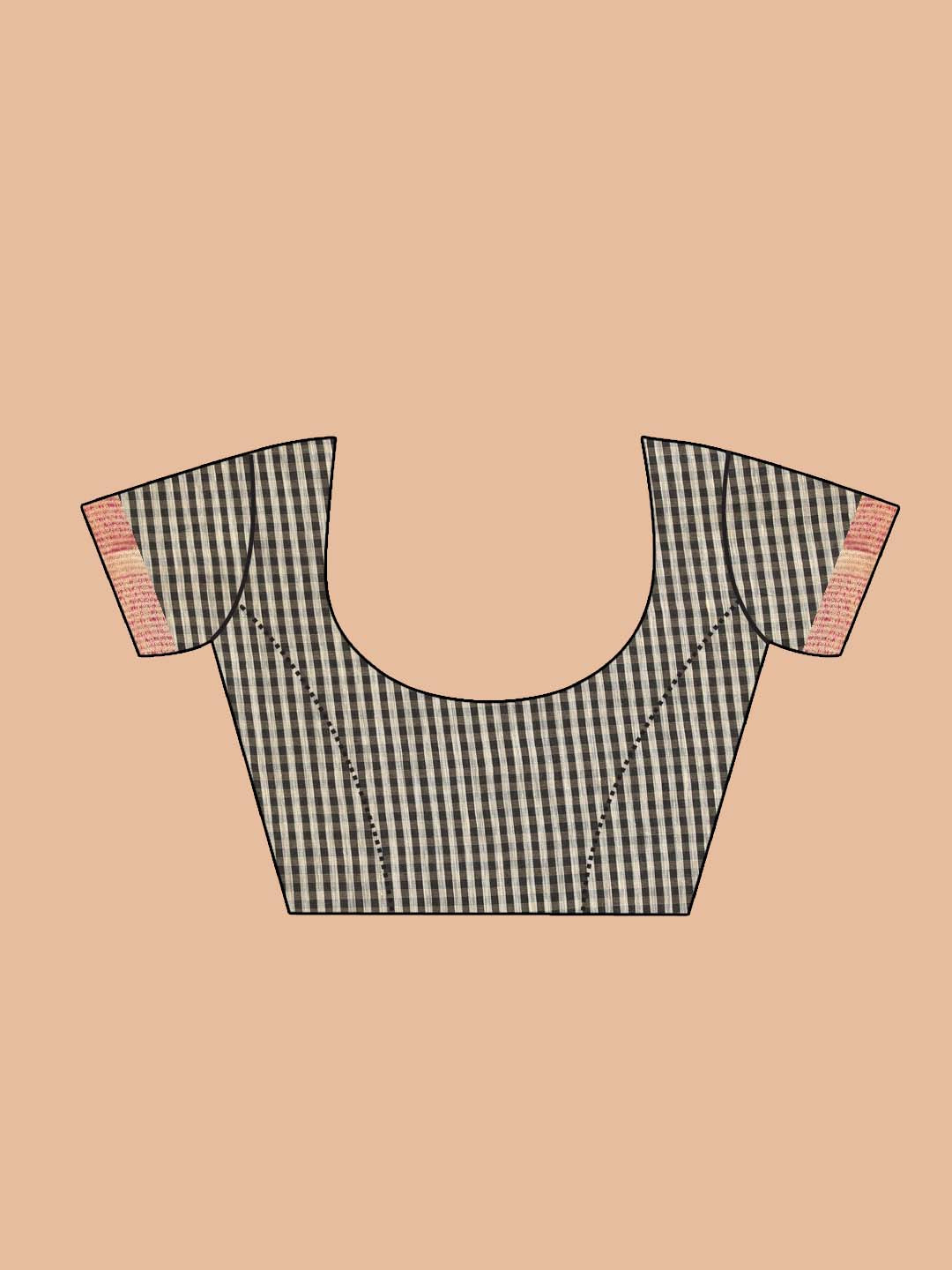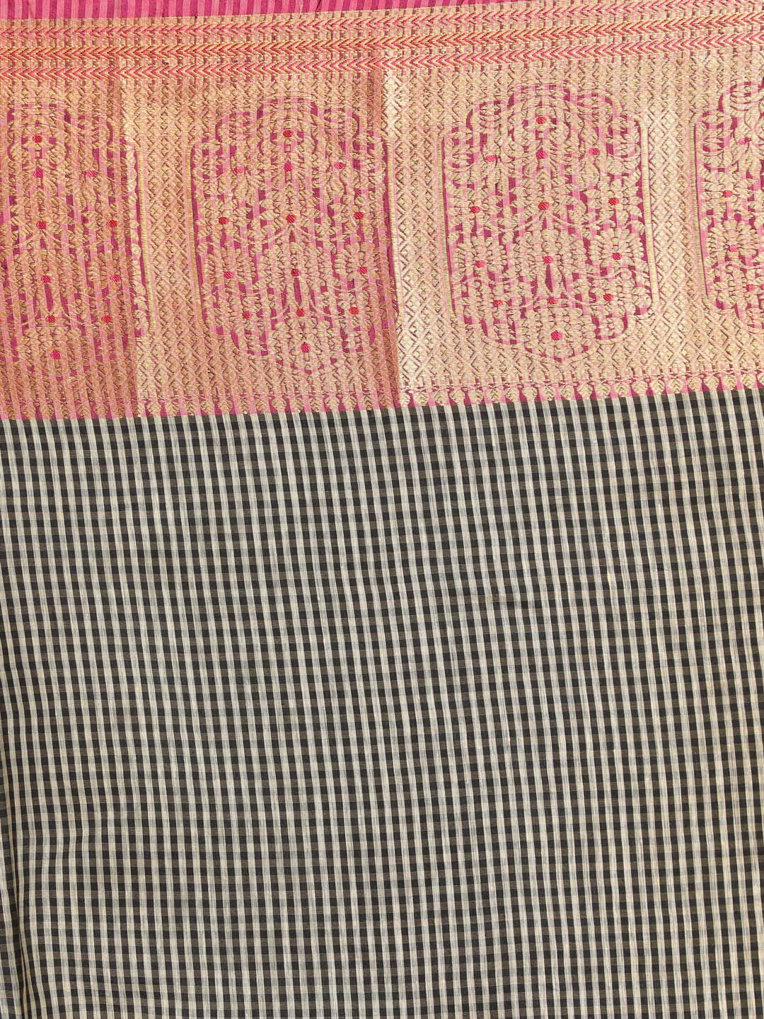 Jaya, the epitome of strength and independence in the business world, dons a formidable woven Banarasi saree, where a compelling black and white small-checked pattern meets a bold magenta border. As an entrepreneur making impactful decisions, the intricate checks symbolize the meticulous planning and attention to detail that defines Jaya's professional journey. The vibrant magenta border adds a splash of confidence, mirroring Jaya's dynamic spirit. In her black and white Banarasi adorned with a magenta border, Jaya exudes a commanding presence, blending tradition with contemporary power, a visual representation of her resilience and unyielding determination in the corporate landscape.